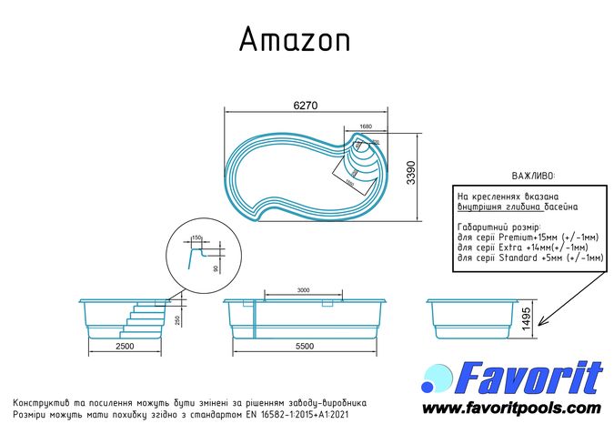 «Амазонка» - це вибір БРАЗИЛІЇ для активних, креативних людей, які прагнуть бути унікальними. Ця модель у бразильському стилі одержала 5 зірок за свій дизайн. Завдяки такому рішенню сходинки не заважають Вам плавати по всій довжині басейну, а також не турбують тих, хто вважає за краще поніжитися в зоні відпочинку. Басейн чудово вписується в ландшафт будь-якого заміського будинку і відразу привертає увагу гостей, які не зможуть встояти, щоб не поринути у прохолодну воду. Оцінивши всі принади незабутнього релаксу, Ви зрозумієте, що басейн – це діамант в ограновуванні Вашої оселі.