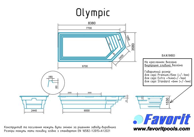 «Олімпік» - це ЄВРОБАСЕЙН, де все продумано до дрібниць. Оптимальні розміри. Сходинки з протиковзкою системою (безпека для дитини) дозволять Вам не думати про небезпеку впасти в басейн. Чаша "Олімпік" також обладнана "підводним диванчиком", який призначений для монтажу гідромасажної системи (лікування спини). Цей басейн користується популярністю не лише за його комфортабельність, а також завдяки його дизайну: правильна форма надає чаші благородного вигляду і дозволяє легко вмістити басейн у будь-якому ландшафті.